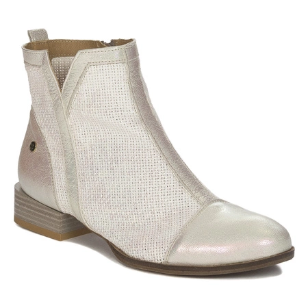 06397-22/00-1Oryginalne, wygodne botki damskie polskiej marki Maciejka to idealna propozycja dla wielbicielek klasycznego, miejskiego stylu. Cholewka w kolorze jasny beż wykonana jest ze skóry naturalnej licowej i tkaniny co zapewnia długotrwałe użytkowanie zważywszy na wysoką jakość materiałów wykorzystanych do produkcji. Model posiada zapięcie na wygodny zamek błyskawiczny od wewnętrznej strony, co ułatwia zmianę obuwia. Wnętrze wykonano ze skóry naturalnej i tkaniny, wkładka botków to skóra naturalna. Wkładka podklejona miękką pianką wpływa na wygodę i wysoki komfort użytkowania. Niewysoki, zgrabny i stabilny obcas 3 cm w naturalny sposób wysmukla nogę i jest solidną podstawą dla całej sylwetki. Eleganckie i stylowe, a jednocześnie bardzo uniwersalnie i efektownie. Z powodzeniem sprawdzą się zarówno do spodni, jak i do sukienki. Wyprodukowano w Polsce. Jakość: I.