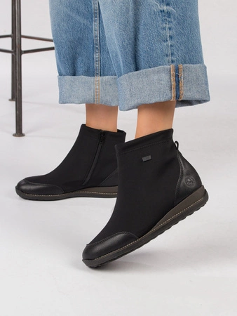 44276-00Najnowsza propozycja tej marki Rieker to niezwykle wygodne, cudowne botki ocieplane damskie. Cholewka została wykonana z tkaniny(membrany) oraz wysokogatunkowego tworzywa w kolorze czarnym. Na wewnętrznej stronie cholewki zamek błyskawiczny ułatwiający zmianę obuwia. Okrągły nosek daje palcom dużo swobody i pozwala na wygodne ułożenie stóp. Wnętrze i wkładka to miękka ocieplina, który doskonale chroni stopy przed zimnem w porze jesienno-zimowej. Botki na płaskiej podeszwie z obcasem o wysokości 3 cm Bardzo modne, niesamowicie wygodne, doskonale sprawdzą się w każdej stylizacji.