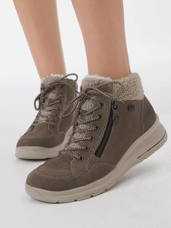 L7701-24Najnowsza propozycja marki Rieker to ocieplane damskie botki. Cholewka została wykonana ze skóry naturalnej zamszowej, nubukowej oraz tkaniny w kolorze brązowym "Brown". Wnętrze tych butów to kożuch syntetyczny, który zapewnia stopom wygodę i ciepło podczas zimowych dni. Wkładkę natomiast wykonano z ociepliny. Okrągły nosek pozwala na wygodne ułożenie palców. Model zapinany jest na zamek błyskawiczny znajdujący się na wewnętrznej stronie cholewki. Dodatkowo posiada możliwość zasznurowania, dzięki czemu można dopasować cholewkę do tęgości stopy. Podeszwa o wysokości 4 cm z tyłu oraz 2 cm na przodzie botków ma formę platformy z lekkim klinem, daje poczucie wygody i komfortu. Model ten pasuje do wielu stylizacji. Idealne na co dzień.
