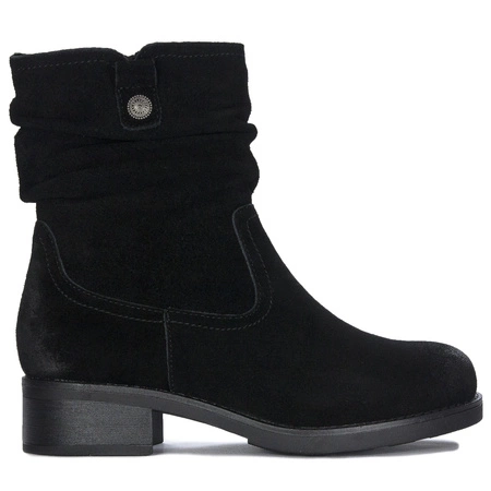 BT355-S-BKWygoda i styl to główne wartości marki Sergio Leone, która z każdym rokiem podnosi swoje standardy, dbając o funkcjonalność i jakość swoich produktów. Prezentowane botki damskie, choć proste w formie, zachwycają elegancją i minimalizmem. Wykonane z czarnego zamszu naturalnego, mają obcas o wysokości 4 cm i okrągły nosek. Zamek błyskawiczny po wewnętrznej stronie ułatwia ich zakładanie. Wnętrze i wkładka są ocieplane miękkim, przyjemnym materiałem, który zapewnia komfort termiczny. Te delikatne, a jednocześnie wyraziste botki doskonale komponują się zarówno z sukienkami, jak i spodniami czy spódnicami, dodając kobiecości każdej stylizacji.