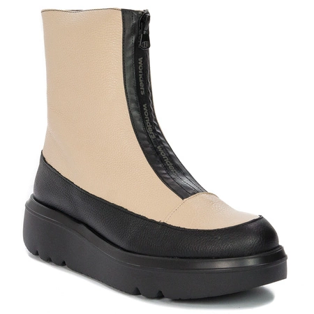 A-2802 WILD NEGRO/CREAMPrezentowany model hiszpańskiej marki Wonders to niezwykle wygodne damskie botki. Cholewka została wykonana z miękkiej skóry naturalnej w kolorze jasnego beżu i czarnego. Wnętrze to wysokogatunkowe tworzywo oraz wkładka ze skóry, zapewniająca duży komfort i wygodę. Z przodu cholewki, ukryty pod ozdobną, czarną taśmą z logo marki, znajduje się zamek ułatwiający zmianę obuwia. Okrągły nosek daje palcom dużo swobody i pozwala na wygodne ułożenie stóp. Solidna, dobrze wyprofilowana podeszwa w formie platformy jest bardzo stabilna i świetnie izoluje od nawierzchni. Bardzo modne, niesamowicie wygodne, doskonale sprawdzą się w połączeniu nie tylko ze spodniami, ale także z sukienką czy spódnicą.