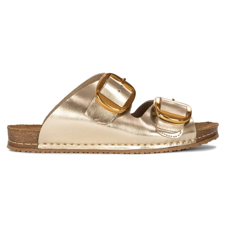 06996-25-00-0Złote klapki damskie Maciejka to elegancka i wygodna propozycja na sezon wiosna-lato 2025. Model wykonany z wysokiej jakości skóry naturalnej – zarówno wierzch, wnętrze, jak i wkładka – zapewnia trwałość, przewiewność oraz komfort noszenia przez cały dzień. Dwa szerokie paski z dużymi, złotymi klamrami nie tylko świetnie trzymają stopę, ale również dodają nowoczesnego i modnego charakteru. Płaski obcas o wysokości 2 cm oraz profilowana podeszwa z wysokogatunkowego tworzywa gwarantują stabilność i wygodę. Klapki posiadają otwarty, okrągły nosek i dobrze dopasowują się do stopy o tęgości F 1/2 – idealne dla szczupłej i normalnej stopy. Połyskujący złoty kolor pięknie komponuje się z letnimi stylizacjami, nadając im szyku i kobiecego wyrazu. Marka Maciejka to synonim jakości i wygody, który sprawdzi się w każdej wakacyjnej garderobie.