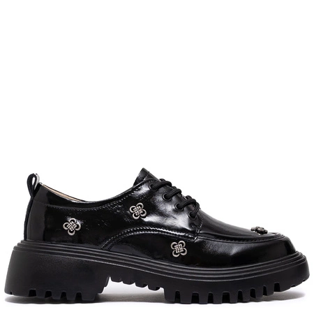 Na co dzień połącz półbuty z czarnymi jeansami o prostym kroju, gładkim topem i oversize’ową ramoneską. Lakierowany połysk oraz metalowe kwiaty dodadzą zestawowi „wow-efektu”, a masywna podeszwa zrównoważy sylwetkę.