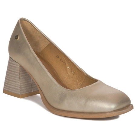 06414-25/00-1Klasyczne czółenka damskie marki Maciejka na słupkowatym obcasie to fason, który musi posiadać każda kobieta lubiąca łączyć elegancję z wygodą. Cholewkę wykonano z miękkiej skóry naturalnej licowej w kolorze złotym metalicznym. Wnętrze również wyściełano skórą naturalną. Miękka, wyprofilowana, skórzana wkładka zapewnia maksimum komfortu. 7-centymetrowy obcas gwarantuje odpowiednie ułożenie stopy oraz doda kilka cennych centymetrów naszej sylwetce. Kwadratowy nosek zapewni palcom dużo swobody. Idealne do absolutnie każdej stylizacji od spodni po spódniczki czy sukienki. W tych wygodnych butach przechodzisz dłuuugie godziny! Jakość I. Kraj pochodzenia: Polska.