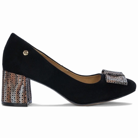 3356A-47/00-1Eleganckie i wyrafinowane czółenka Maciejka to doskonały wybór dla kobiet, które cenią sobie klasykę z nowoczesnym akcentem. Cholewka wykonana z wysokiej jakości zamszu pięknie układa się na stopie, a ozdobna kokarda w wężowy wzór dodaje butom oryginalności i charakteru.