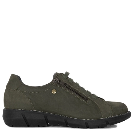 Czujesz, że Twoim codziennym stylizacjom brakuje wygody bez rezygnowania ze stylu? Te półbuty marki Maciejka w odcieniu zieleni khaki łączą miękką, naturalną skórę z praktycznymi rozwiązaniami, które ułatwiają życie. Cholewka ma subtelne, dekoracyjne przeszycia, a charakterystycznym wyróżnikiem są elastyczne sznurowadła bez wiązania oraz podwójny suwak po bokach języka – dzięki nim buty zakładasz jednym ruchem. Okrągły, zamknięty nosek i sprężysta, lekko podwyższona podeszwa (ok. 3,5 cm pod piętą) dbają o naturalny krok i całodzienny komfort. To idealny, casualowy model na co dzień: do pracy, na spacer, do miasta.