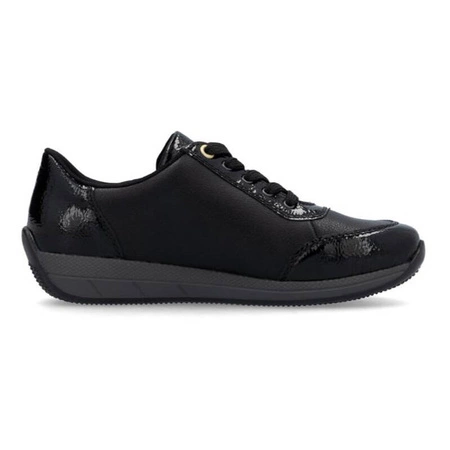 N1112-02Eleganckie półbuty damskie marki Rieker wykonane z wysokiej jakości skóry naturalnej i tworzywa sztucznego w kolorze czarnym. Cholewka posiada wstawki z lakierowanego materiału. Wnętrze butów jest wyściełane miękką tkaniną. Posiadają wygodną wkładkę z naturalnej skóry. Model z zapięciem na zamek i sznurowaniem. Te buty sprawdzą się w wielu różnych stylizacjach. Idealne na każdą okazję w ciągu dnia.
