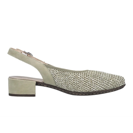 47060-52Rieker półbuty damskie w kolorze zielonym to idealne połączenie wygody i elegancji. Wykonane z wysokiej jakości naturalnej skóry, zapewniają trwałość i komfort noszenia. Posiadają zamknięty, migdałowy nosek oraz otwartą piętę, co nadaje im subtelny, kobiecy charakter. Dzięki paskowi jako zapięciu buty dobrze dopasowują się do stopy. Płaski obcas o wysokości 4 cm zapewnia stabilność i komfort nawet podczas dłuższego użytkowania. Wnętrze i wkładka wykonane z wysokogatunkowego tworzywa i tkaniny gwarantują wygodę. Doskonałe na sezon wiosna-lato 2025, sprawdzą się zarówno w codziennych, jak i bardziej eleganckich stylizacjach.