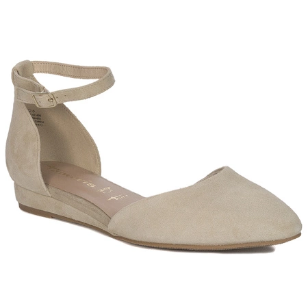 1-24241-42 400Prezentujemy piękne sandały z zabudowanym noskiem niemieckiej marki Tamaris. Cholewka wykonana ze skóry welurowej w beżowym kolorze. Zabudowany, migdałowy nosek nadaje stopie piękny, smukły kształt. Pasek posiada regulowaną sprzączkę, która ułatwia zakładanie/zdejmowanie obuwia oraz pomagają stabilizować je na nogach. Wnętrze z miękkiej tkaniny, a wkładka to tworzywo wysokogatunkowe. Kwadratowy, płaski obcas jest stabilny, wygodny i lekko unosi sylwetkę dodając jej kobiecości. Bardzo wygodne, lekkie i eleganckie. Super dodatek do wielu stylizacji.