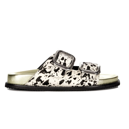 75453-COWDamskie klapki Gioseppo w biało-czarnym wzorze to stylowa i wygodna propozycja na lato. Wykonane z naturalnej skóry i zamszu, zapewniają komfort noszenia oraz trwałość. Płaska podeszwa z lekkim podwyższeniem (3 cm) wspiera stopę i umożliwia wygodne użytkowanie przez cały dzień. Regulowane paski pozwalają na idealne dopasowanie do stopy. Modny, oryginalny design sprawia, że świetnie komponują się zarówno z casualowymi, jak i bardziej wyrazistymi stylizacjami.