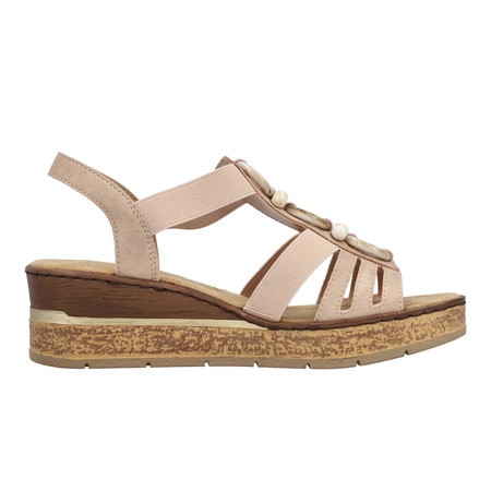 63778-31Różowe sandały Rieker to doskonałe połączenie kobiecego stylu i codziennej wygody. Lekki koturn o wysokości 5,5 cm subtelnie wysmukla sylwetkę, nie rezygnując z komfortu. Elastyczne paski i brak zapięcia sprawiają, że buty świetnie dopasowują się do stopy i są łatwe w zakładaniu. Stylowa ozdoba z przodu dodaje im uroku i wyróżnia je na tle innych modeli. Miękka tkaninowa wkładka oraz przewiewna konstrukcja to gwarancja komfortu nawet w upalne dni. Idealne na letnie spacery, spotkania czy urlopowe wyjścia.