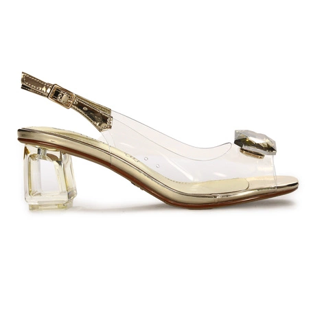 S-346-GOLDZłote sandały damskie Sca'viola na przezroczystym pasku to wyjątkowe połączenie nowoczesnego designu i ponadczasowej elegancji. Model osadzony na stabilnym, słupkowym obcasie o wysokości 6,5 cm, zapewnia komfort oraz efektowne wydłużenie sylwetki. Kwadratowy nosek i otwarta pięta idealnie wpisują się w najnowsze trendy, a połączenie złota z bezbarwnym tworzywem dodaje lekkości. Wnętrze oraz wkładka ze skóry naturalnej gwarantują wygodę podczas długich wyjść. To idealny wybór do stylizacji koktajlowych, weselnych i wieczorowych. Model pochodzi z kolekcji Wiosna-Lato 2025 i podkreśla luksusowy charakter marki Sca'viola.