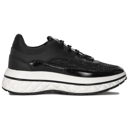 FLPKYRELE12 BLACKNajnowsza propozycja od amerykańskiej marki Guess to modne i wygodne, pasujące do wielu różnych stylizacji, zarówno sportowych jak i casualowych sneakersy na platformie. Cholewka wykonana ze skóry naturalnej oraz tkaniny w kolorze czarnym i jest ozdobiona czarnymi, połyskującymi cyrkoniami. Wnętrze obszyto przyjemną, miękką tkaniną. Wkładkę można wyjąć i zmienić na inną wedle uznania. Sznurowadła pozwalają dopasować cholewkę do szerokości stopy według własnych potrzeb i upodobań. Całość osadzona na biało czarnej, oryginalnej i bardzo stabilnej platformie, o wysokości 3,5-5,5 cm. Na języku umieszczono logo marki w kolorze białym. Ten model to idealne uzupełnienie dla wielu wyróżniających się stylizacji.