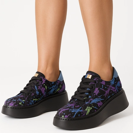 Już na pierwszy rzut oka widać unikatowe DNA tego modelu. Cholewka z naturalnej skóry nubukowej zdobiona jest abstrakcyjnymi pociągnięciami w odcieniach fioletu, błękitu i zieleni. Okrągły nosek dba o swobodę palców, a zamknięta pięta oraz szerokie, czarne sznurowadła trzymają stopę pewnie w rytmie dnia. Subtelny, kontrastowy zapiętek oraz połyskująca aplikacja-kamień w kształcie kropli dodają butom modowego pazura. To sneakersy-półbuty stworzone do roli pierwszoplanowej: wystarczy jeden element, by zwykły look zamienić w zjawiskową stylizację.