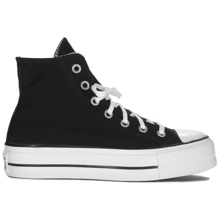 560845CTrampki damskie wysokie z linii All Star znanej na całym świecie marki Converse wykonane z czarnej tkaniny. Wnętrze butów oraz wkładka również uszyte są z tkaniny. Okrągły kształt czubka zapewnia dużo miejsca na palce stóp. Sznurowadła czynią obuwie łatwe w zakładaniu i dostosowaniu do stopy. Płaska podeszwa typu platforma wykonana z wysokiej jakości tworzywa ma wysokość 4 cm. Jest charakterystyczna dla tego typu obuwia sportowego. Trampki są lekkie i praktyczne, dzięki czemu stanowią doskonałe uzupełnienie każdego sportowego lub casualowego stroju.