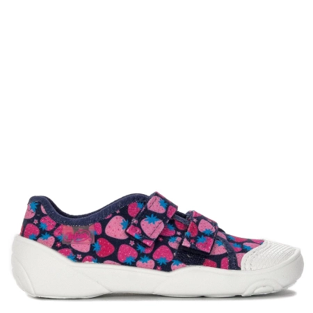 907P153BEFADO to polska marka obuwnicza z ponad 90-letnią tradycją. Łączy ona doświadczenie z nowoczesnymi technologiami do produkcji obuwia najwyższej jakości zgodnie z panującymi trendami w świecie mody. Przedstawiamy miękkie i bardzo wygodne półbuty, tenisówki dziecięce dziewczęce tej cenionej marki. Wierzch i wnętrze są wykonane z tkaniny w kolorze granatowo-różowym z kolorowym wzorem truskawek. Wkładka to również tkanina. Biała, płaska, antypoślizgowa podeszwa ma wysokość 2 cm, daje duże poczucie komfortu i wygody. Rzepy ułatwiają zmianę obuwia i stabilizują buciki na stopach oraz pozwalają dopasować cholewkę do odpowiedniej szerokości. Lekkie, bardzo wygodne i praktyczne.