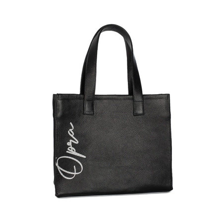 OP-T-02-BLACKTorebka damska Open marki OPRA. Wykonana ze skóry naturalnej w kolorze czarnym. Wnętrze wyściełane jest czarną tkaniną. W środku znajduje się jedna kieszonka zapinana na zamek. Uchwyty maja długość 36 cm i wysokość 17 cm.