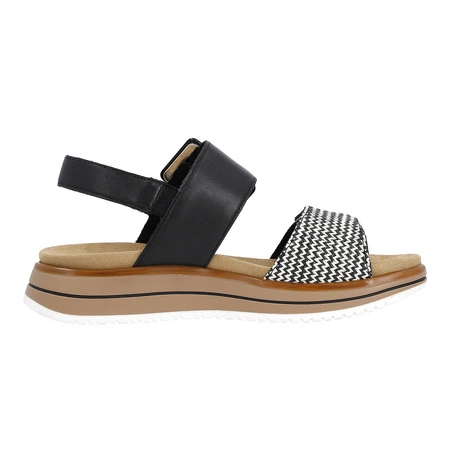 D1J53-02Damskie sandały Rieker w kolorze czarnym to idealny wybór na sezon wiosna-lato 2025. Wykonane z wysokogatunkowego tworzywa, zapewniają trwałość i komfort noszenia. Posiadają okrągły, otwarty nosek oraz płaski obcas o wysokości 3,5 cm, co czyni je wygodnym obuwiem na co dzień. Wnętrze oraz wkładka zostały wykonane z miękkiej tkaniny, a wierzch ze skóry naturalnej, co gwarantuje odpowiednią wentylację stopy. Model ten doskonale łączy elegancję i praktyczność, stanowiąc świetny dodatek do letnich stylizacji.