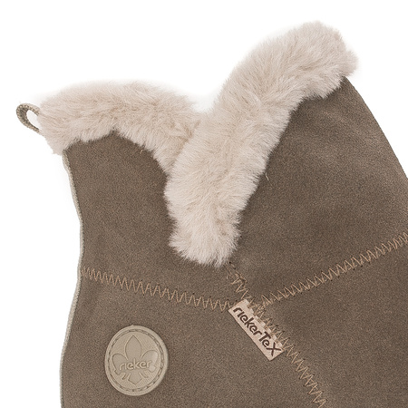 M6050-64The latest offering from the well-known and well-loved brand Rieker is an extremely comfortable women's boots. The upper was made of natural suede leather in beige "Beige" color. The interior of these boots is synthetic sheepskin, which provides feet with comfort and warmth during winter days. The insole with the MemoSoft system, on the other hand, is made of soft fabric. The round toe allows the toes to sit comfortably. The model is fastened with a zipper located on the inner side of the upper. The whole set on a low, stable platform, the height of which is 4 cm. The model provides maximum comfort. Suitable for many autumn and winter styling.