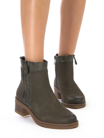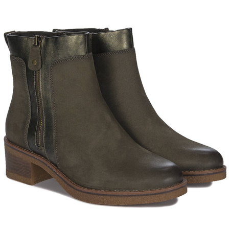 2-25064-43 726Marco Tozzi is a brand that combines Italian elegance with German precision and extreme comfort. Its products are characterized by attention to detail, sophisticated design, timeless style and durability. In our store we offer the latest model of Marco Tozzi women's boots for the upcoming autumn-winter season, which is an absolute hit of the season. The boots are made of natural leather and high-quality material of green color - Khaki Comb. The zipper located on the inner side of the upper makes it easy to put on and take off the shoes, and the outer zipper is a decoration. The interior and insole of the boots, are lined with soft, insulated fabric, provides warmth and comfort. The rounded nose gives the toes freedom, and the flexible sole with a 5 cm high heel perfectly insulates the feet from cold and wet weather, while offering high comfort. The shoes are extremely comfortable and lightweight.
