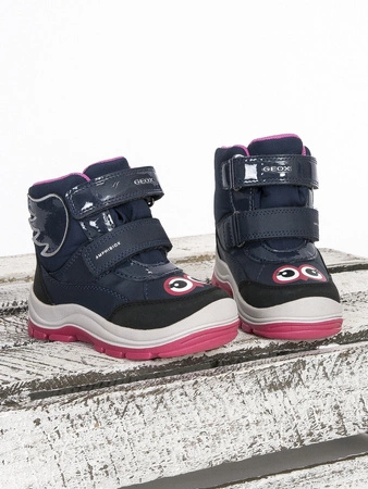 B463WA 054FU C4268Children's boots from GEOX are the perfect choice for winter days. Made of eco-leather and fabric in a delicate navy blue color, they provide warmth thanks to the soft sheepskin inside. The interior is equipped with a fabric insert, and a flat pink sole with a height of 2 cm and a rounded toe guarantee comfort while wearing. The clasp with two Velcro allows easy and quick put on. These boots are a perfect combination of comfort, warmth and stylish appearance, perfect for the youngest.
