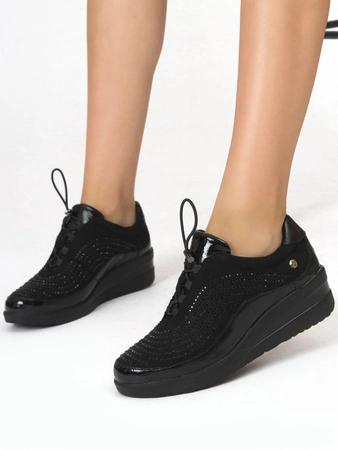 P2124-01/00-7The latest women's shoes from the autumn/winter collection from the Maciejka brand are an original proposal for women who appreciate unique style and comfort. The upper is made of natural velour and varnished leather in black, adjusting to the foot thanks to elastic laces with a stopper. The interior of the shoes is made of fabric and natural leather, and the insole is natural leather. The round tip provides freedom to the toes, making every step comfortable. The sole made of durable plastic is 4.5 cm in height at the heel and 2 cm at the front. The model goes well with everyday styling. Quality I.