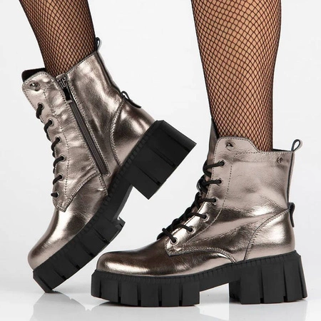 DBT6438/24 GNThe latest model of women's boots - baggers of the brand for the autumn-winter season. The upper was made of high-quality natural leather in silver “Gun Metal” color. The round toe gives the toes a lot of freedom and allows for comfortable positioning. The side zipper makes it easy to change shoes, and the laces allow you to better adjust the upper. Soft and comfortable interior made of warm fleece gently wraps and warms the feet and gives a sense of comfort. Model on a platform with a height of 3 cm in the front with a heel of 5 cm. Ideal for both dresses, skirts and pants. Quality: I. Tensity specified by the manufacturer - G.