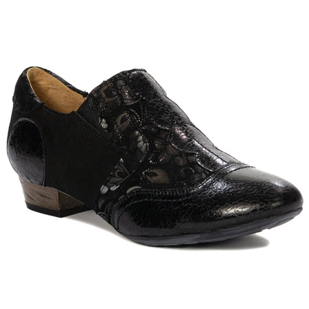 06593-01/00-5The latest model of women's shoes from the spring/summer collection of the Polish brand Maciejka is a unique proposal for fashionable women who appreciate comfort. The upper is made of lacquered and velour natural leather in shades of black with a floral motif. The shoes are zippered and have an almond toe. The interior and insole are finished with soft natural leather for comfortable wear. The 2.5 cm high heel adds subtle elegance. This model is perfect for everyday casual styling. Made in Poland, quality: I.