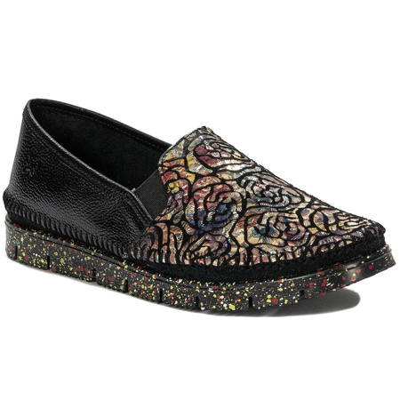 03512-68-00-0Maciejka is one of the better-known footwear brands on our domestic market, but not only. It bases its production on natural leathers and top quality components. Footwear of this brand is solid, comfortable and in line with world fashion canons. We present a sporty model of half-shoes of this brand in black color with a beautiful colorful floral pattern on the front. The upper, interior and insole are entirely made of natural leather. The upper was enriched with two side rubber inserts, whose task is to adjust the footwear to the width of the foot. The rubber sole is very flexible, which significantly contributes to the comfort of use. The model is very lightweight, versatile, suitable for many different styles. It is a combination of practicality with comfort and, of course, incredible beauty and originality. Ideal for ladies living in a constant state of flux, valuing comfort and functionality. Made in Poland. Quality: I.