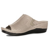 AMI-L25-157-SGREYBeige T. Sokolski flip-flops are a perfect combination of comfort and universal style for summer days. The upper made of natural leather is distinguished by a subtle perforated pattern that provides breathability and lightness. A 5-centimeter wedge with a platform guarantees comfort and stability with every step. The leather insole and interior increase the comfort of wearing, even all day long. The model with an open toe and heel provides excellent ventilation on hot days. The neutral, beige color can be easily matched to most summer styles. Flip-flops from the Spring/Summer 2025 collection by Sokolski are not only comfort, but also feminine elegance for everyday use.