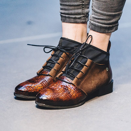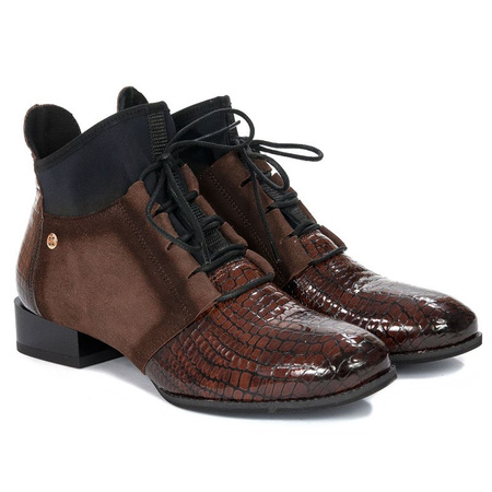 04744-02/00-7Maciejka is a Polish brand that produces women's shoes. Shoes of this brand are made of the highest quality natural leather, which is a guarantee of comfort, convenience and versatility. Models produced by the Maciejka brand follow the latest trends, also remaining in the classic design framework. The company's priority is customer satisfaction, and here is a model that meets all these criteria. The upper is made of natural chamois leather (slightly "smoky" on the edges), lacquered with a reptile motif and a flexible brown fabric. The asymmetrical upper part of the upper creates an interesting form. The sole is a flexible, high-quality material with a stable, flat, square heel, which significantly affects the comfort of use. The interior is made of fabric, and the insole is made of a soft fleece, which provides our feet with optimal temperature. Lacing on the front of the upper will allow the shoes to perfectly fit the foot. High comfort of use in combination with an effective appearance is a characteristic feature of these shoes. So if you value comfort and originality, this pattern is for you.