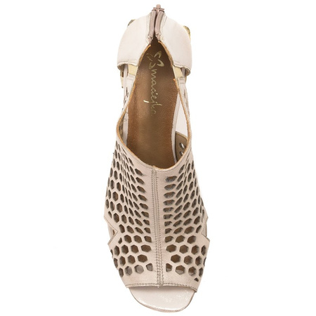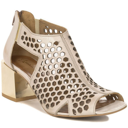 04593-25/00-5Maciejka is a brand whose products catch the eye not only with original, fashionable designs, but also with the quality of components and incredible comfort. The company's offer includes models for every season of the year. The new summer proposition from Maciejka is an extremely comfortable and quite built-up model of sandals with free fingers. The openwork upper in shades of beige and gold with its structure resembles a "honeycomb". On the sides of the upper there are short, elastic bands that help to adjust its width to the required needs. The classic zipper on the heel makes it easy to change shoes and is an interesting decoration of the model. The interior and insole are made of natural, high-quality leather. The low, 6 cm, square, gold heel beautifully slims the leg and provides a stable base for the entire figure. The original design makes the shoes easily add character to any styling.