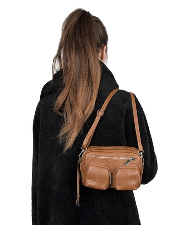 FLLE 4-601-U DOL CU SVenezia brand handbag made of very good quality natural leather in a matching brown color. The inside of the bag is trimmed with black fabric with the Venezia logo printed on it. The bag consists of one compartment. There is one zippered pocket inside. Additionally, 3 outer pockets with zippers. The metal fittings are silver in color. The bag has a detachable strap with an adjustable max. 110 cm long. Dimensions: height 15 cm, width 21 cm, depth 8 cm. Despite its small size, it will certainly accommodate all the necessary feminine trinkets. Do not hesitate, order today and have fun with the colors matching this model to different styles.