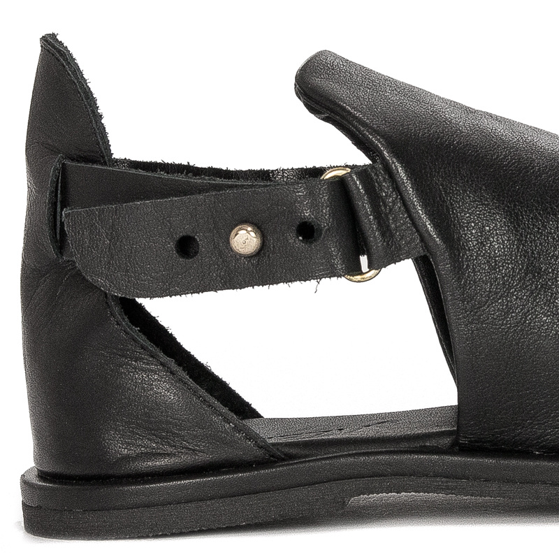 35422300 BlackSimplicity and classics, but of course in an elegant edition. This is how you can briefly describe women's sandals of the well-known and appreciated brand VENEZIA. Beautiful, light women's sandals with an upper made of natural grain leather in a classic black color. A universal cut on a 1 cm flat sole, perfect for work or shopping. Fastened with a buckle with a pin latch, the open toe has a slightly square shape, which gives the fingers a lot of freedom. The leather insole is extremely soft and significantly increases the comfort of walking and prevents feet from sweating. Universal and delicate, they will be a great addition to many summer stylizations.
