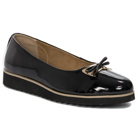 DP4133/22 BKWomen's shoes are a type of footwear that will never go out of fashion. The presented model by Filippo with its cut resembles the well-known and popular ballerinas on the platform. The top is made of black patent leather with a beautiful bow on the front. The tip of the shoe has a round shape. These combinations make up the originality of these shoes. The insole is made of natural leather, the interior is finished with a fabric, and the sole is made of high-quality material. Standard footwear width - G. The heel is 3 cm high and the front platform is 1.5 cm. Comfort and a great look are guaranteed as soon as you put these shoes on your feet. Quality: I.
