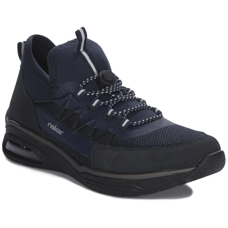 M5658-14Przedstawiamy damskie półbuty marki Rieker. Cholewka w kolorze granatowym "Blue" jest wykonana z wysokiej jakości tworzywa oraz tkaniny, nadając butom sportowego charakteru. Ten model świetnie komponuje się z różnymi stylizacjami. Wnętrze buta oraz wkładka zrobione są z miękkiej tkaniny, co gwarantuje komfort noszenia. Wkładka jest profilowana oraz wyjmowana, dzięki czemu można ją wymienić na inną według uznania. Płaska podeszwa jest wykonana z elastycznego tworzywa. Buty są stabilizowane na nodze za pomocą gumek ściągających ze stoperem zamiast tradycyjnego sznurowania. To doskonała alternatywa dla klasycznych butów sportowych, idealna zarówno do pracy, jak i na spacer po mieście.
