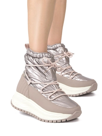 DBT6647/24 GOŚniegowce damskie od marki Filippo to pozycja obowiązkowa w zimowej szafie każdej modnej kobiety. Cholewka wykonana z wysokogatunkowego tworzywa oraz ortalionowej tkaniny w kolorze złotym. Model jest wyposażany w sznurowadła. Wkładka to ciepły i miły w dotyku kożuszek syntetyczny, a wnętrze to ocieplana tkanina, która przyjemnie otula stopy w chłodne dni i zapewnia im właściwy komfort cieplny. Okrągły nosek daje palcom dużo swobody, a elastyczna platforma nie tylko doskonale izoluje stopy od podłoża, ale i sprawia, że każdy wykonany w tych butach krok jest pewny i stabilny. Pasują do wielu stylizacji.