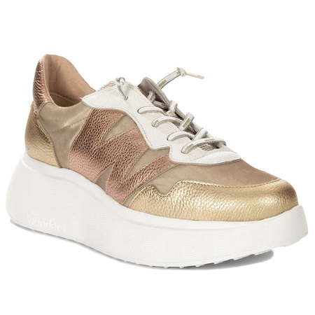A-3622Przedstawiamy stylowe i wygodne sneakersy damskie marki Wonders z kolekcji Wiosna-Lato 2025. Wykonane z wysokogatunkowej skóry naturalnej w połączeniu z materiałem tekstylnym w złotym kolorze, te buty łączą elegancję z nowoczesnym stylem. Podeszwa na platformie zapewnia stabilność i komfort noszenia, a elastyczne sznurowadła pozwalają na dopasowanie butów do stopy. Dzięki zamkniętemu noskowi oraz okrągłemu kształtowi buty gwarantują wygodę i doskonałe dopasowanie. Idealne do codziennych stylizacji, które wymagają połączenia komfortu z modnym wyglądem.