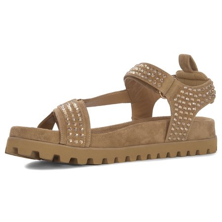 V251703Sandały damskie Alma En Pena w odcieniu piaskowego beżu to połączenie wygody, stylu i subtelnego blasku. Wykonane z wysokogatunkowej tkaniny oraz naturalnej skóry wewnątrz, zapewniają komfort noszenia nawet przez cały dzień. Stabilna platforma z tworzywa o wysokiej jakości daje świetne podparcie i amortyzację. Otwarta konstrukcja z okrągłym noskiem oraz zapięciem na rzep gwarantuje idealne dopasowanie do stopy. Kryształowe zdobienia nadają im niepowtarzalnego, kobiecego charakteru. To doskonała propozycja na sezon Wiosna-Lato 2025 dla kobiet, które lubią wyróżniać się z tłumu. Alma En Pena jak zwykle zachwyca detalami i jakością wykonania.