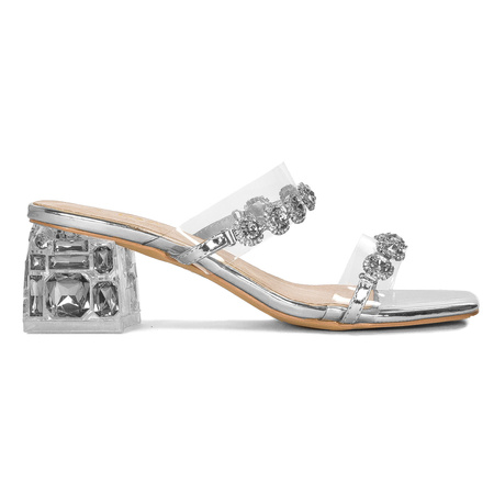 S.Barski Klapki damskie na obcasie z kryształkami Silver srebrne